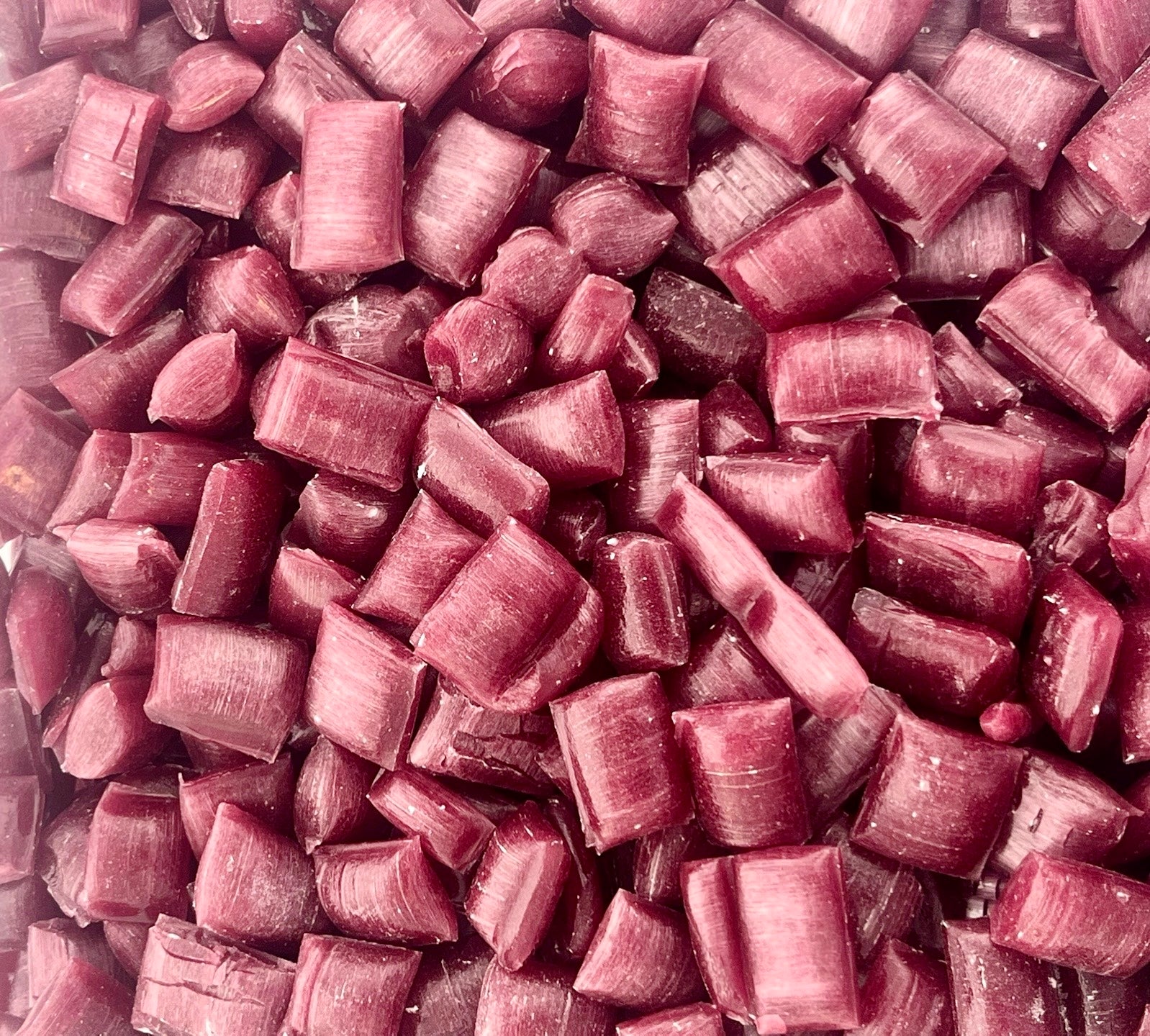 We live in a grape growing state and this region certainly has its favorite varieties of grapes. This candy is made with concord grape juice and you can taste the purple lol. But honestly the purple color comes from the all natural black currant concentrate we used to color the candy. This flavor is a staple and you will find it all year at our home.